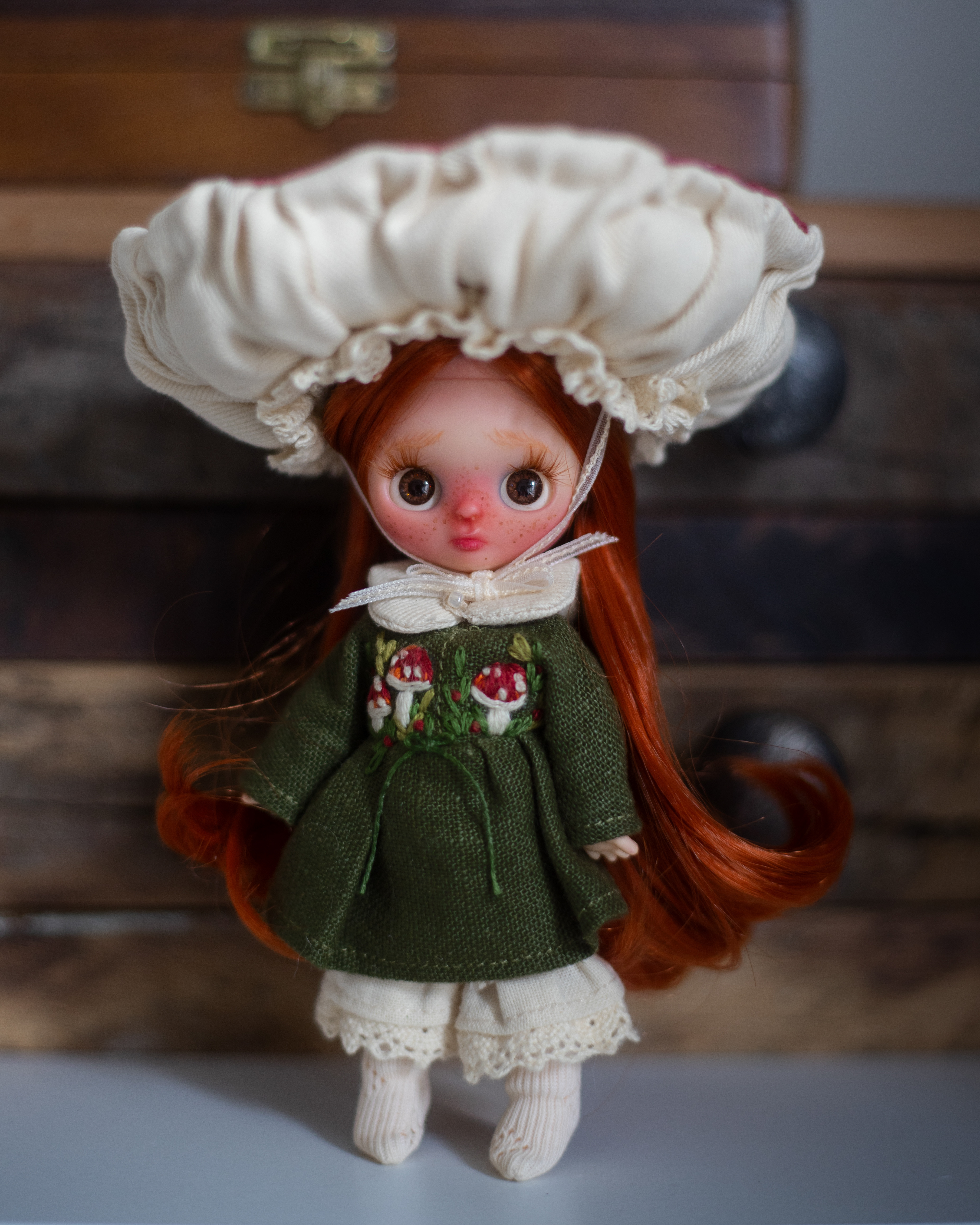 • Fully handmade outfit: green linen dress, natural linen pants, velvet and linen, hand-embroidered mushroom hat, socks, tiny red leather shoes